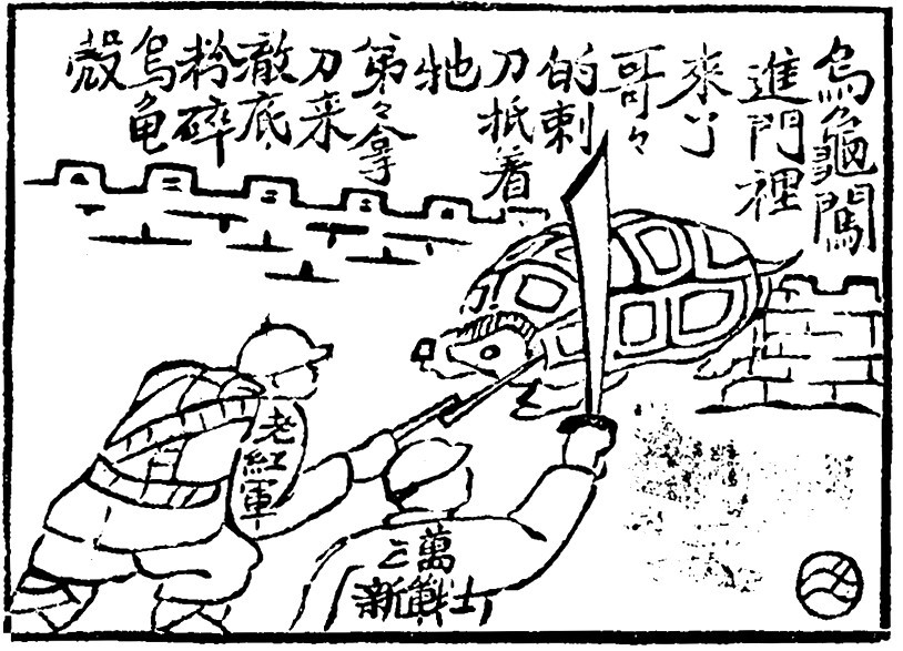 乌龟闯进门里来了,哥哥的刺刀抵着它,弟弟拿刀来彻底粉碎乌龟壳(《红色中华》第233期1版)