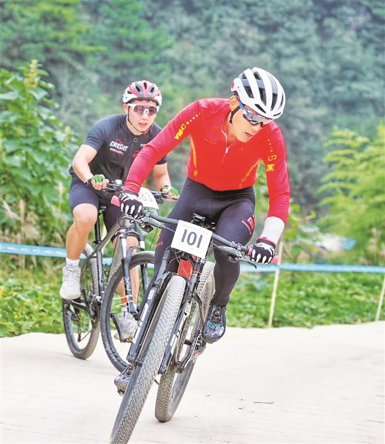 巴黎奥运会中国代表团山地自行车项目选手、亚运会冠军米久江领骑。 刘昌敏 摄