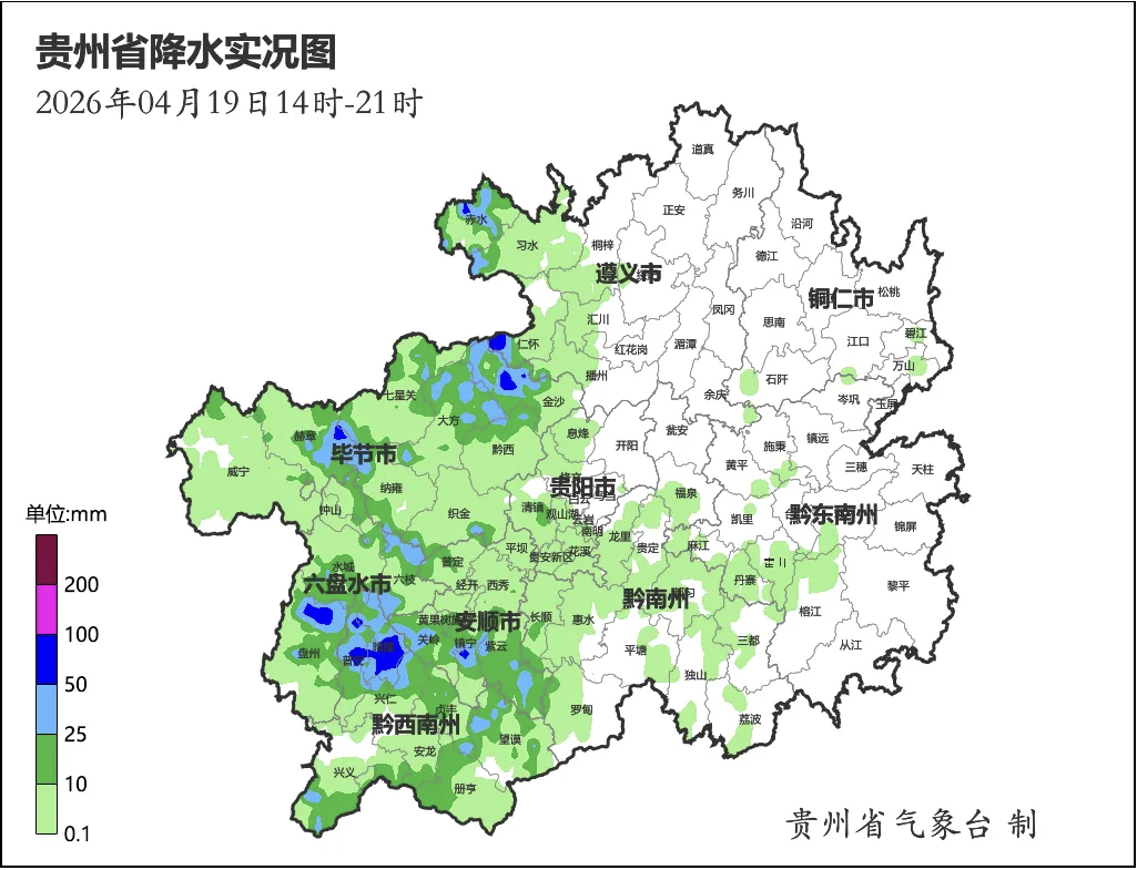 记者从贵州省气象台获悉,4月19日14时至21时,全省出现明显强对流天气。其中,大暴雨出现在黔西南州晴隆县境内3个观测站,分别为东观街道东观十字115.5毫米、鸡场镇鸡场112.5毫米、鸡场镇杨柳105.3毫米;暴雨出现在六盘水六枝、盘州,安顺镇宁,毕节纳雍、赫章、金沙,遵义习水、仁怀、赤水,黔西南兴义、普安、晴隆等12个县(市)域内57个观测站;另有大雨186站、中雨393站。全省共有30个县(市、区)240站次出现短时强降水,小时雨强最大值出现在晴隆县鸡场镇,达104.2毫米(19日19—20时)。