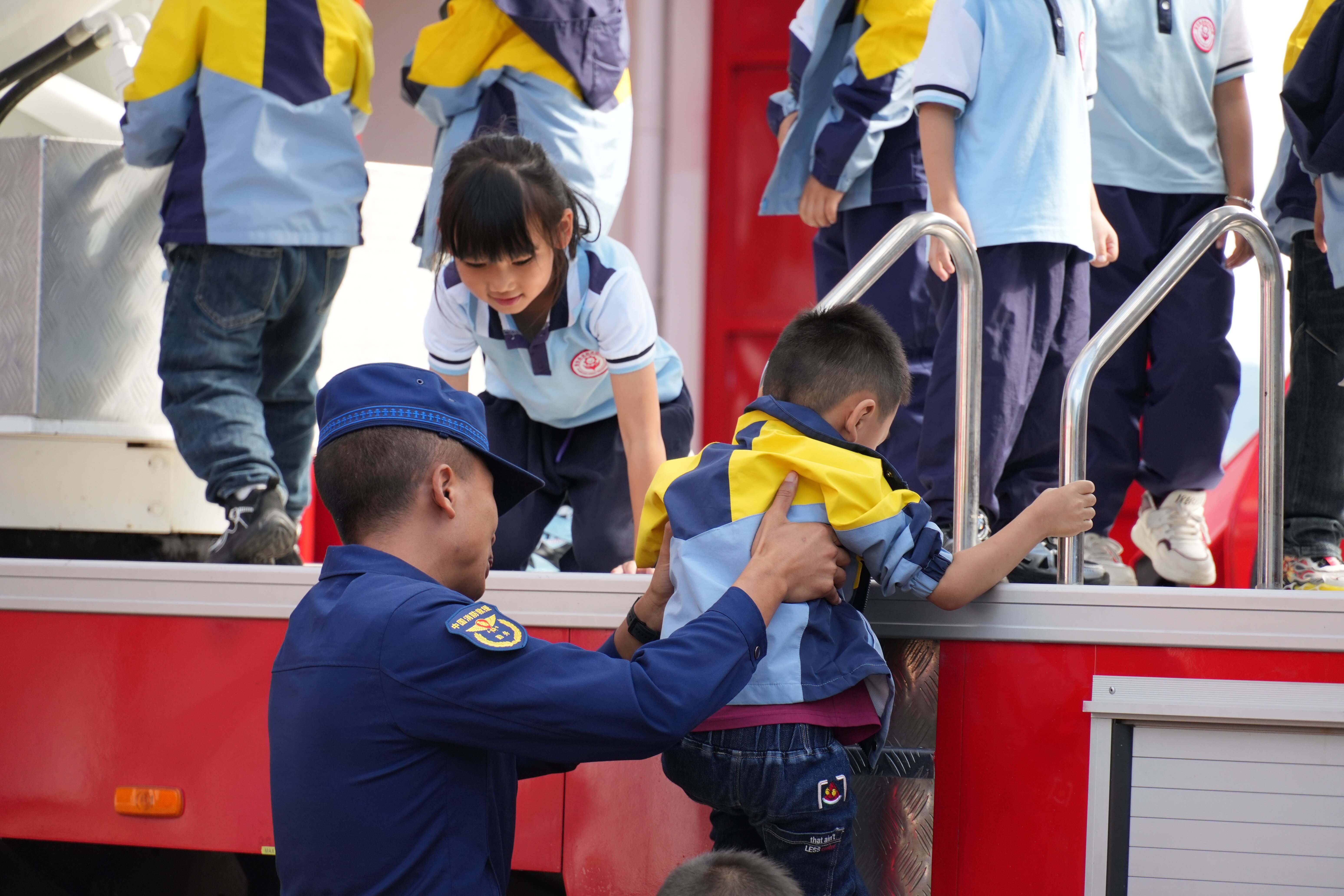 随后,萌娃们在消防员的帮助下,小心翼翼地穿上灭火战斗服,真实体验当一回“小小消防员”的感受。最让孩子们兴奋的当属体验消防车环节了,在听完各种装备介绍后,孩子们好奇地钻进车里,感受着消防车的独特魅力。