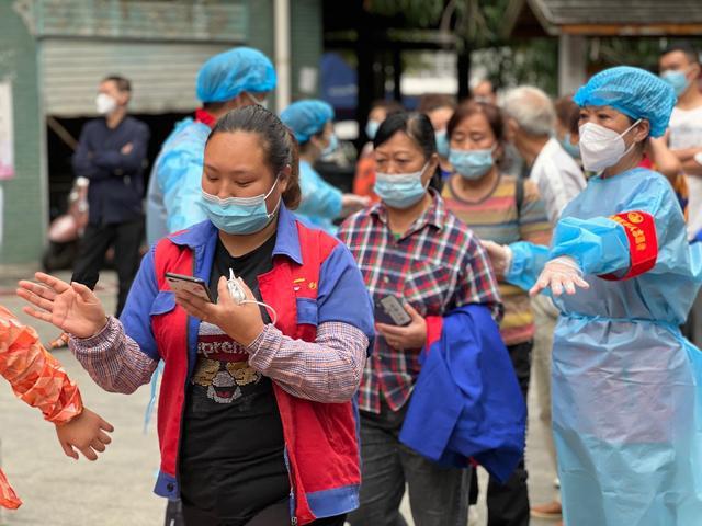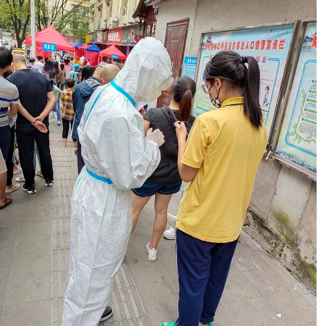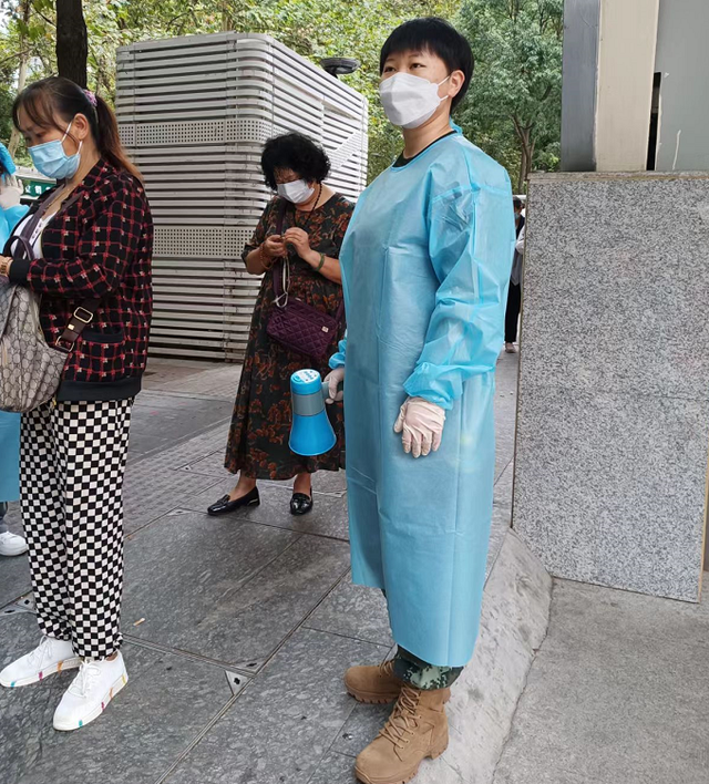 “各位叔叔阿姨、大哥大姐、弟弟妹妹们,请大家戴好口罩,认真排好队,保持好距离”。丁文淑手持扩音喇叭,一遍又一遍向前来采核酸的群众宣传采样点的防控政策。丁文淑也是在今年9月从武警某部队退役。当得知所在的观水路社区采样点人手短缺后,她立即报名成为志愿者,协助维护秩序。