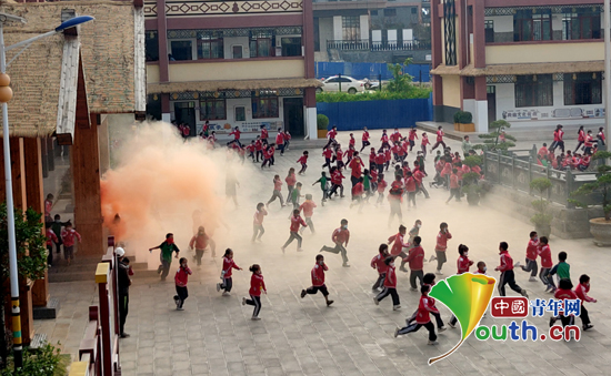 当急促的警报声响起,同学们在研支团成员的引导下弯腰弓身,用毛巾、衣物等掩住口鼻,快速有序撤离教室,逃离火灾现场,到达预定地点并清点人数。