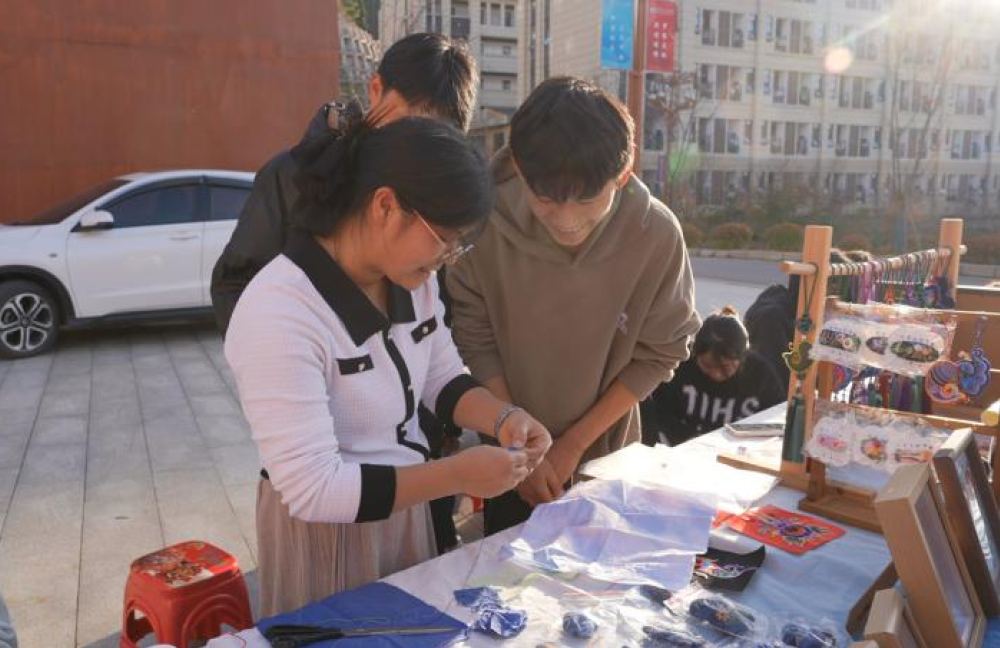 活动在轻松愉悦的互动体验中拉开序幕。“民族同心转盘”趣味答题环节,师生们在游戏中学习了解多民族风俗文化,欢声笑语中增进了对中华文化多元一体格局的认知。“民族同心寄语”签名活动汇聚了师生们对民族团结的真挚祝福,一句句“民族团结一家亲”的留言,道出了大家共同的心声。非遗集市上,苗绣、银饰等传统手工艺的展示与互动,让师生近距离感受到民族文化的深厚魅力。