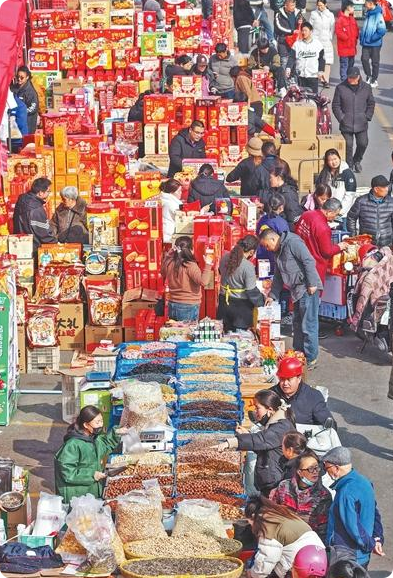 据统计,2025年社会消费品零售总额首次突破50万亿元大关,最终消费支出对经济增长的贡献率达52%。春节将至,各地多措并举繁荣节日市场、激发消费活力。图为消费者在江苏扬州汤汪街道的年货大集选购年货。孟德龙摄(新华社发)