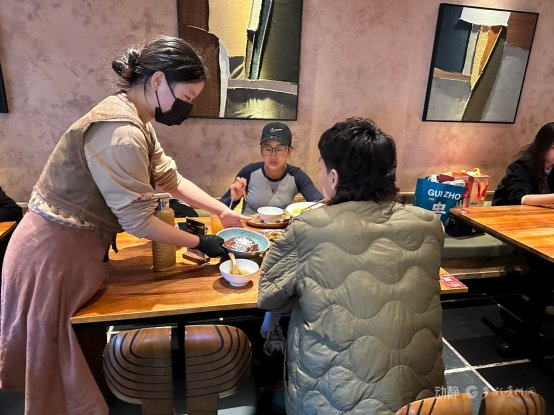 一条街上的烟火气离不开潮流饮品、特色美食与非遗文创交织共生,越来越多的餐饮店通过挖掘贵州特色山货,创新黔菜口感和工艺,满足年轻人的好奇和消费需求。