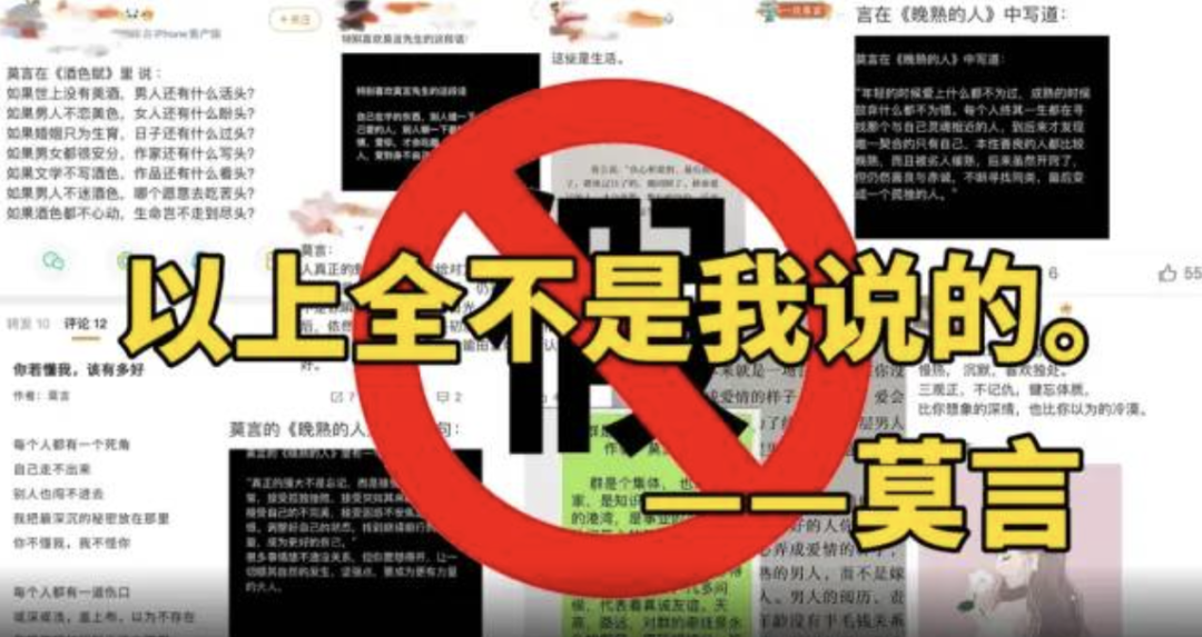 对于这些署名莫言的作品,他表示:"以上都不是我说的。——莫言",并配上了"告辞"表情包。