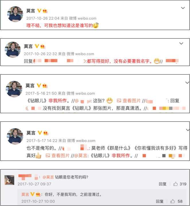 对于一些冒名作品,莫言曾多次发微博澄清。