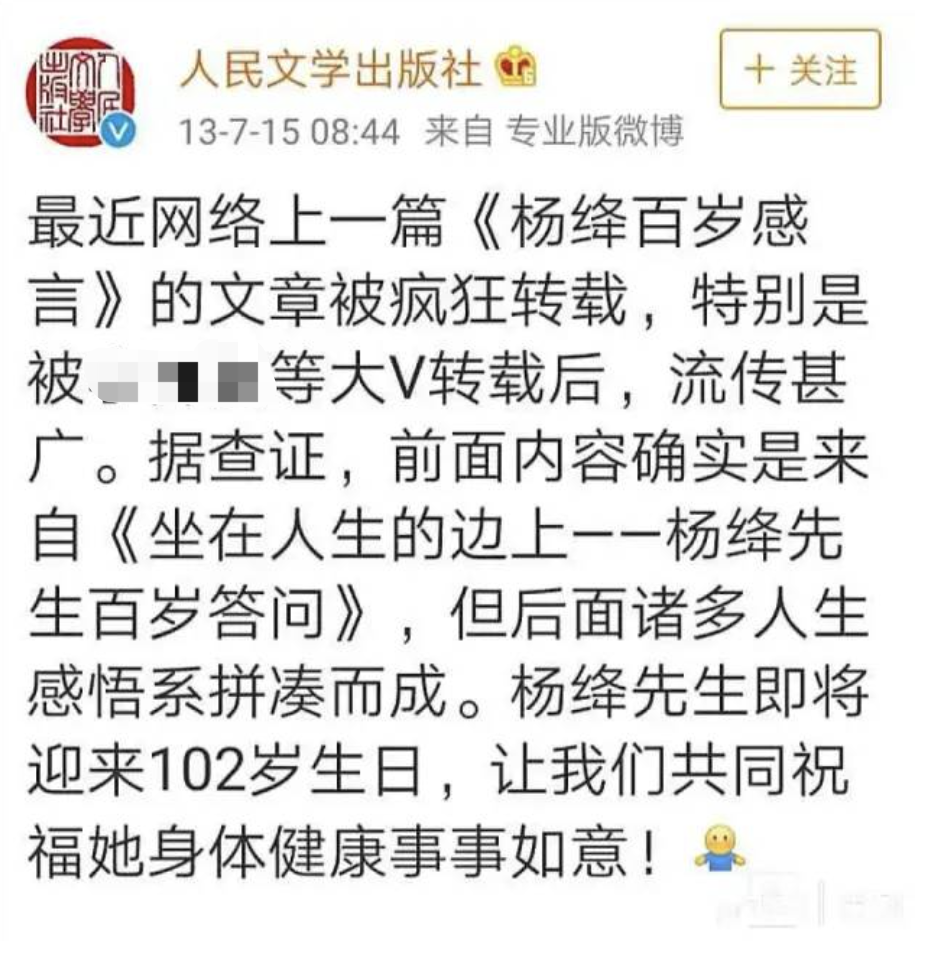 据潇湘晨报消息,2013年杨绛生日前后,"杨绛百岁感言"在网络上流行一时。杨绛作品版权所属的人民文学出版社在问询过杨绛本人之后,正式在官微辟谣。