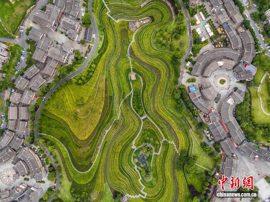 盛夏时节,位于贵州省毕节市大方县奢香古镇的古彝梯田绿意盎然,景色宜人。奢香古镇是大方县易地扶贫搬迁安置区,也是国家4A级旅游景区,保留了彝族文化风情特色,古彝梯田被称为“城市梯田”,是古镇核心景观,梯田里种植有观赏茶树和玫瑰花,从空中俯瞰如大地上的一枚美丽指纹。图为7月25日航拍奢香古镇的古彝梯田。