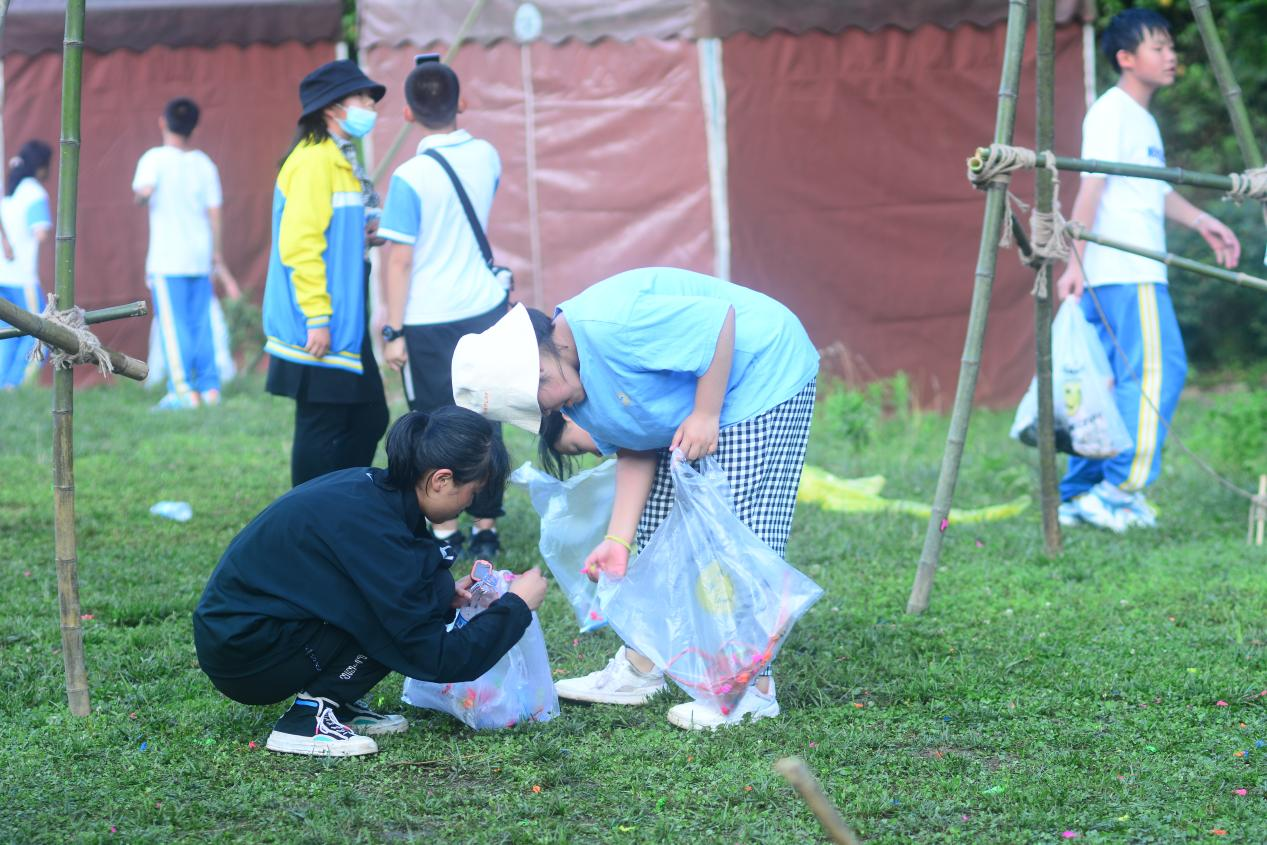 活动中全程都在贯穿LNT理念—无痕山林,关注并身体力行地保护与维护当地的生态环境,学生们快速将自己制造的垃圾清理干净。