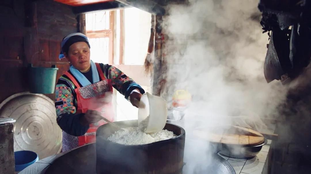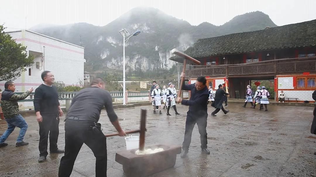 打糍粑是苗族同胞欢度春节的重头戏。用猛火将糯米蒸熟,趁着热气倒进木臼中,两人抡着特制的木锤搓打,这是个技术活,看着容易可不简单。
