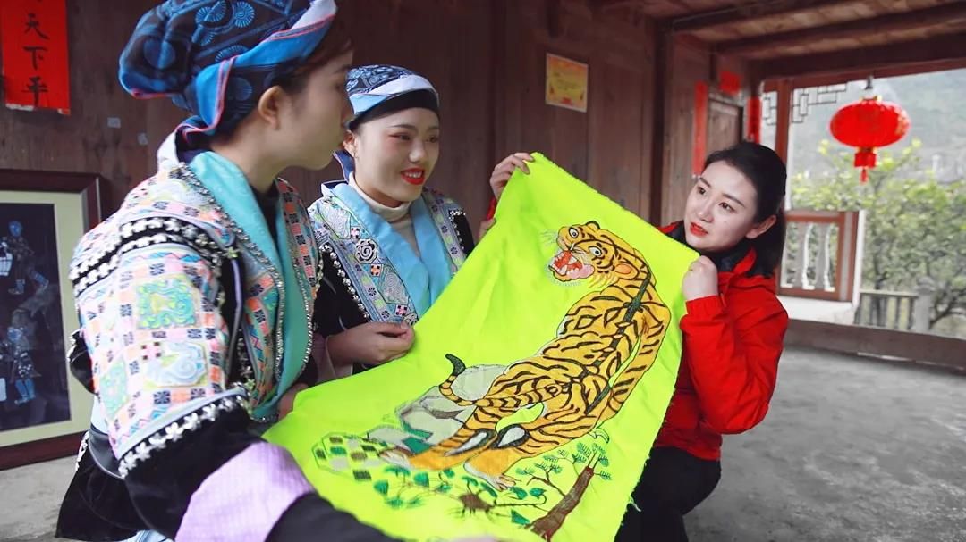 “年”不仅是一个喜庆的节日,更是中国人对春的喜爱,对新年的祝福。虎年到来,心灵手巧的苗族妇女们拿出看家本领,各显身手,制作出带有“虎”“福”元素的传统刺绣、蜡染作品,每一件作品灵动可爱,惟妙惟肖,一针一线都展现了苗寨乡村的变化与发展,表达出对祖国和家人满满的祝福。