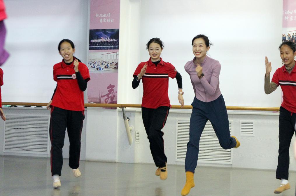 11月28日,北师大实验华夏女中舞蹈教师温馨(右二)在“心舞课堂”展示课上带领学生进行舞蹈热身,让学生借助舞蹈放松身心。