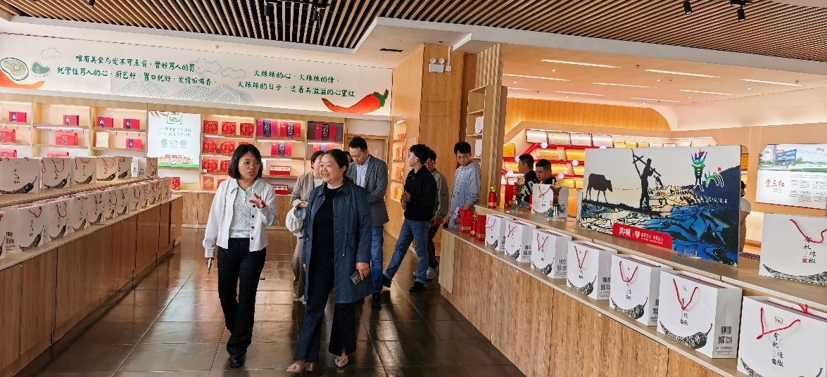 在贵三红食品有限公司相关负责人的陪同下,邢丹一行先后深入企业生产基地、研发中心及产品展示区,实地查看辣椒生产、发酵、产品品控等关键环节的运行情况,详细询问各环节技术难点与实操痛点,并就当前产业发展中存在的品种专用化程度不高、加工适应性评价不足、栽培与加工环节衔接不够紧密等突出问题,与企业相关技术人员开展现场交流探讨,精准掌握产业一线需求。
