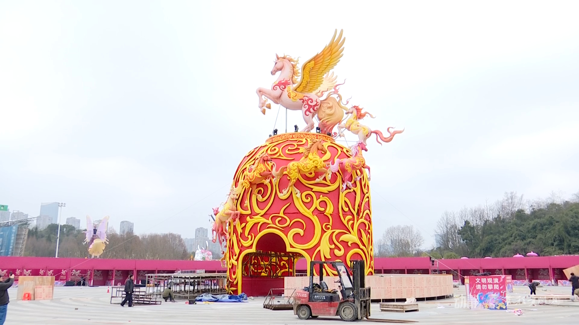 本届灯会以马年为核心主题,规模与设计水准均创历届之最。作为“门面担当”,千户迎宾灯组已搭建完成;核心灯组“八骏呈祥”以马年生肖为灵感,而“大美贵州”灯组则成为展现贵州女性文化与民族底蕴的标志性景观。