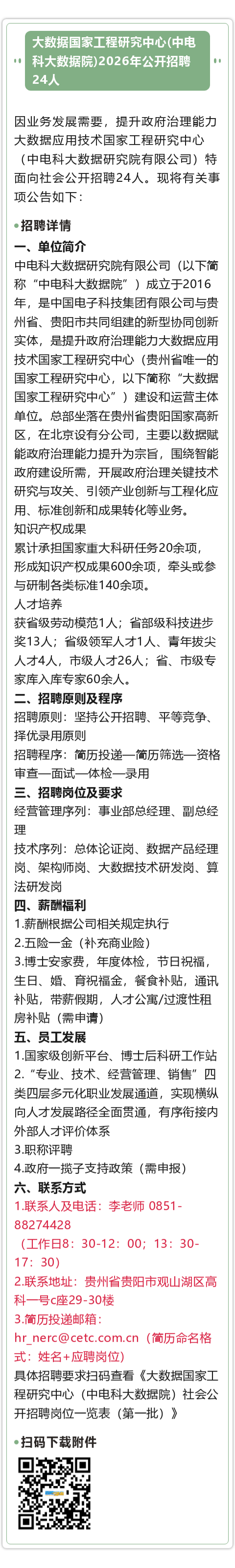 大数据国家工程研究中心(中电科大数据院)招聘24人!