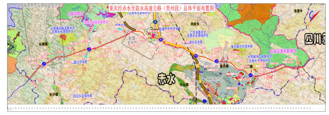 作为串联川黔渝三省市的重要交通干线,渝赤叙高速(贵州段)起点位于赤水市长期镇与四川合江县宝福镇交界处,接四川合江段;终点止于川黔省界两汇水村附近,接四川叙永段。项目路线全长54.274公里,拟采用双向4车道高速公路技术标准建设,设计速度100公里/小时。
