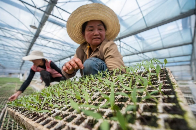 辣椒育苗基地里村民正在为辣椒苗除草(罗大富 摄)