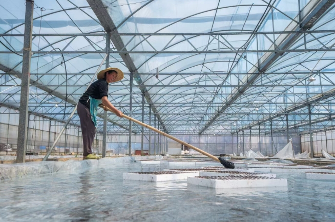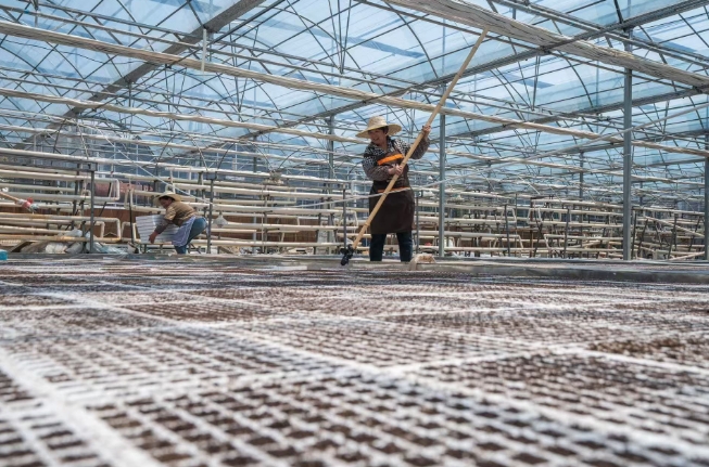 辣椒育苗基地里村民正在摆放漂浮盘(罗大富 摄)