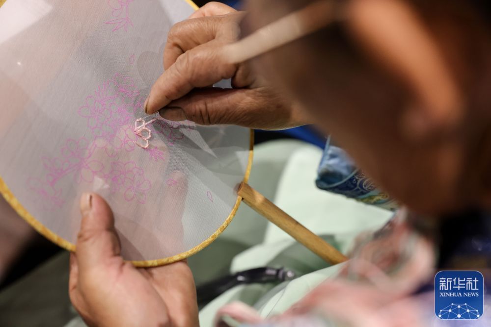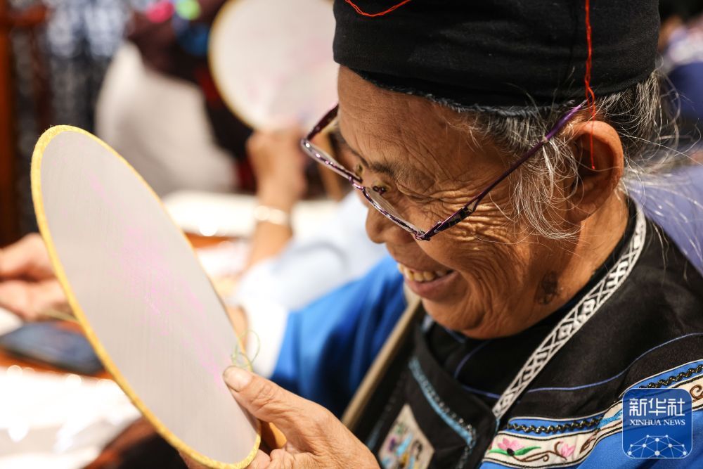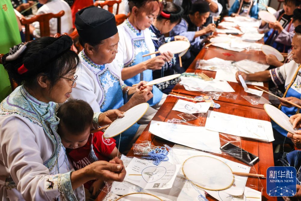 8月26日,贵阳市花溪区青岩镇山王庙村的妇女在刺绣扇面。