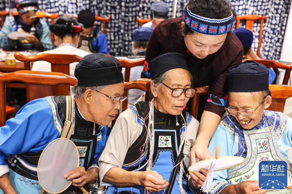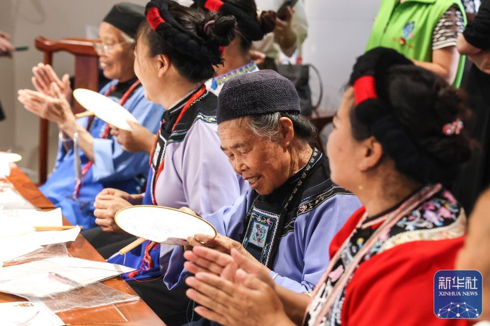 8月26日,贵阳市花溪区青岩镇山王庙村的妇女在老师(后)指导下刺绣扇面。