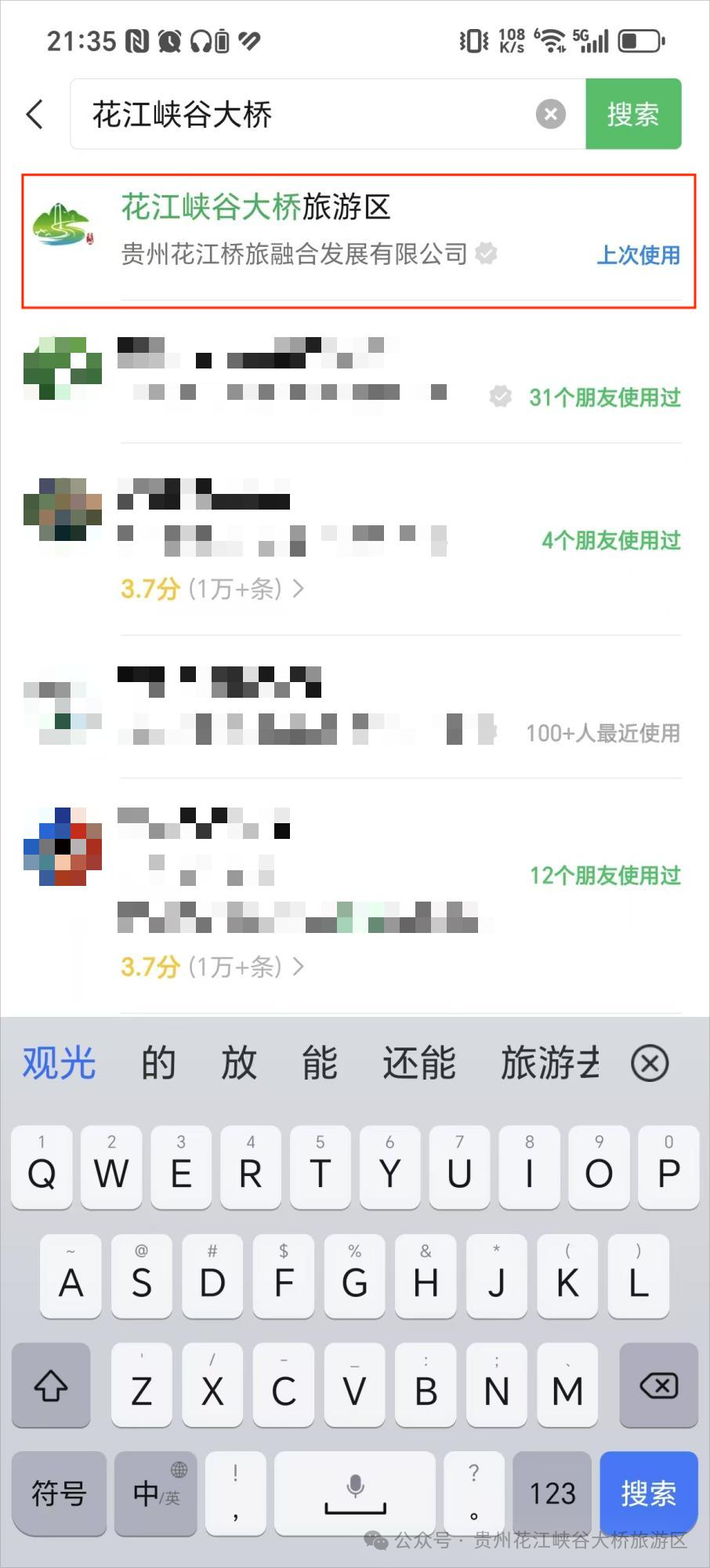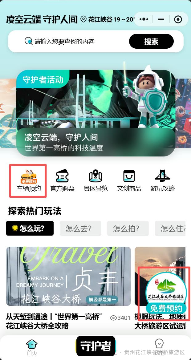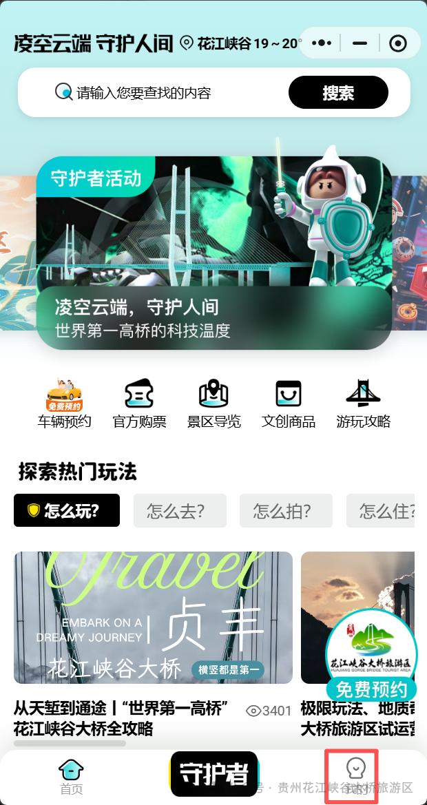 1.打开微信/支付宝搜索“花江峡谷大桥旅游区”小程序,并进入系统: