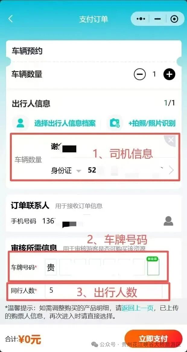 4.录入预约车辆及出行人数信息,点击“立即支付”(该支付不会产生任何费用):