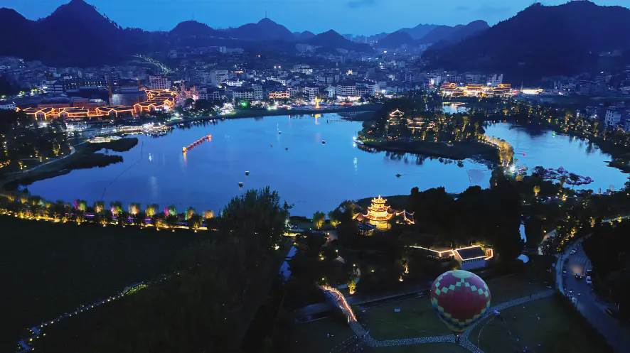 夜幕降临,市民游客来到黔西南州安龙县招堤景区,登上装饰精美、悬挂着璀璨灯笼的“龙舟”,在湖面上随波缓行,伴着星星点点的灯光,一边吹着凉爽的晚风,一边欣赏迷人的夜景,沉浸式感受“人在画中游”的畅快。