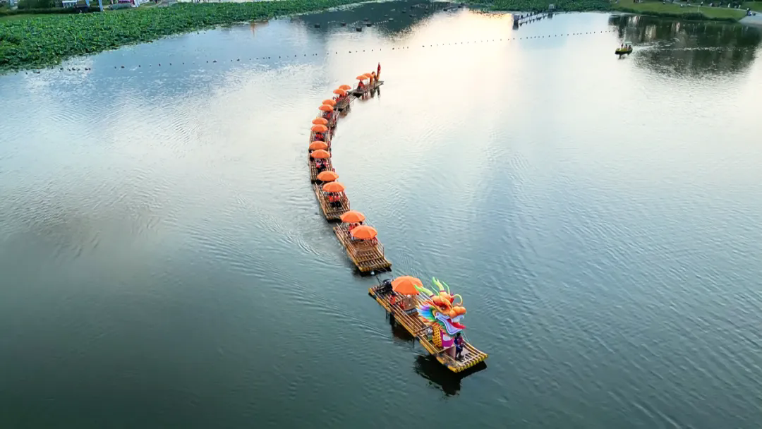 此次在招堤景区陂塘河水域上线的龙舟游湖项目,由遵义商会和黔西南看点影视传媒集团有限公司共同打造运营。该龙舟长约58米,由8节竹筏串联而成,船上分区设置双人座椅,背撑遮阳伞,让游客尽享舒适。