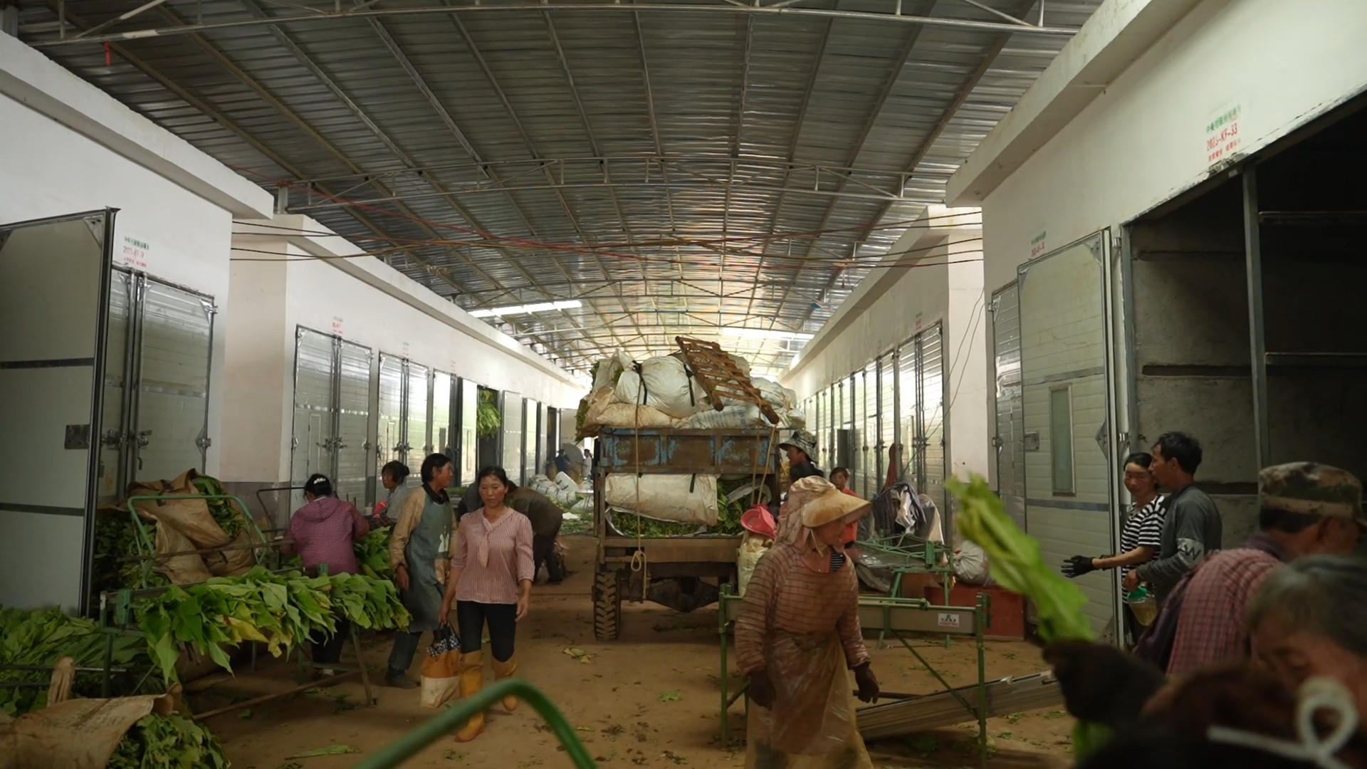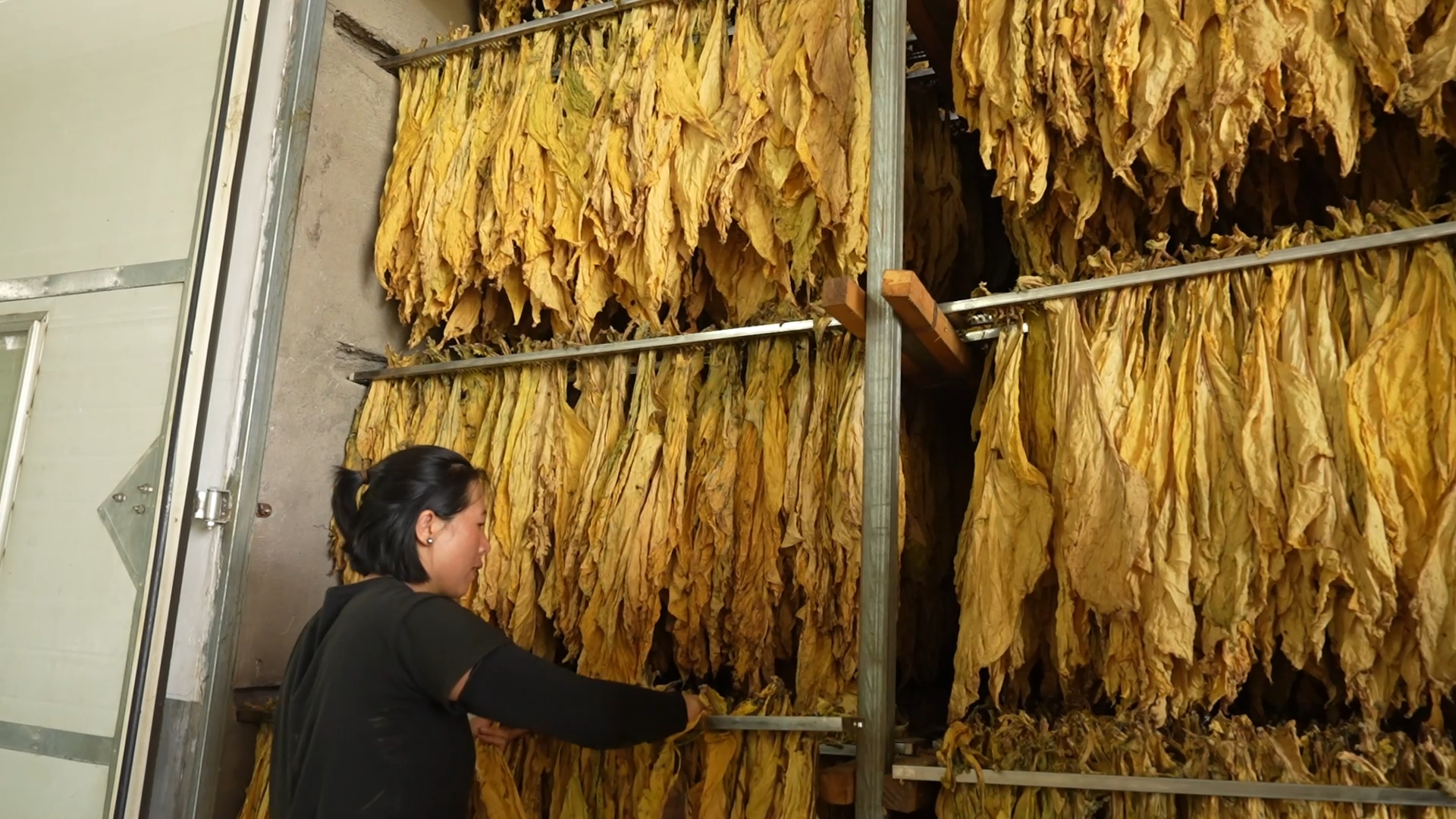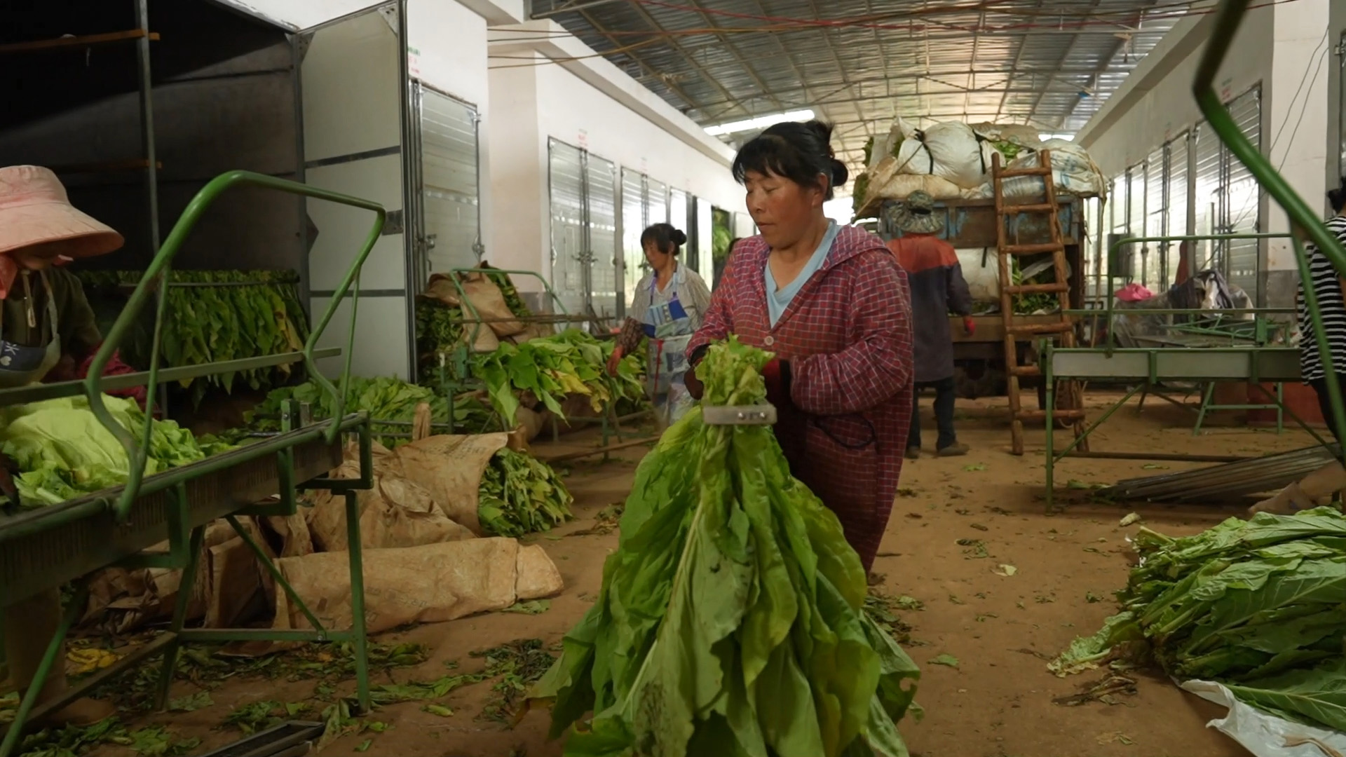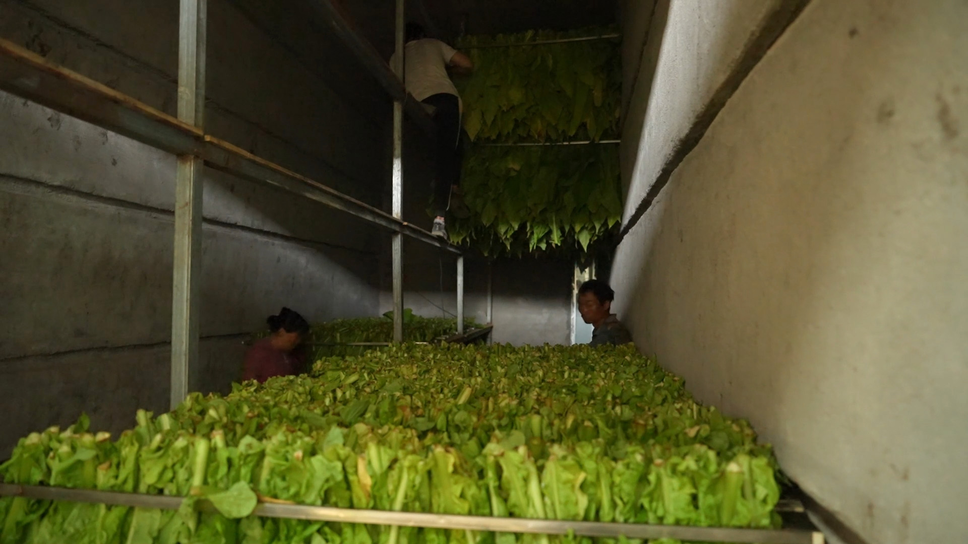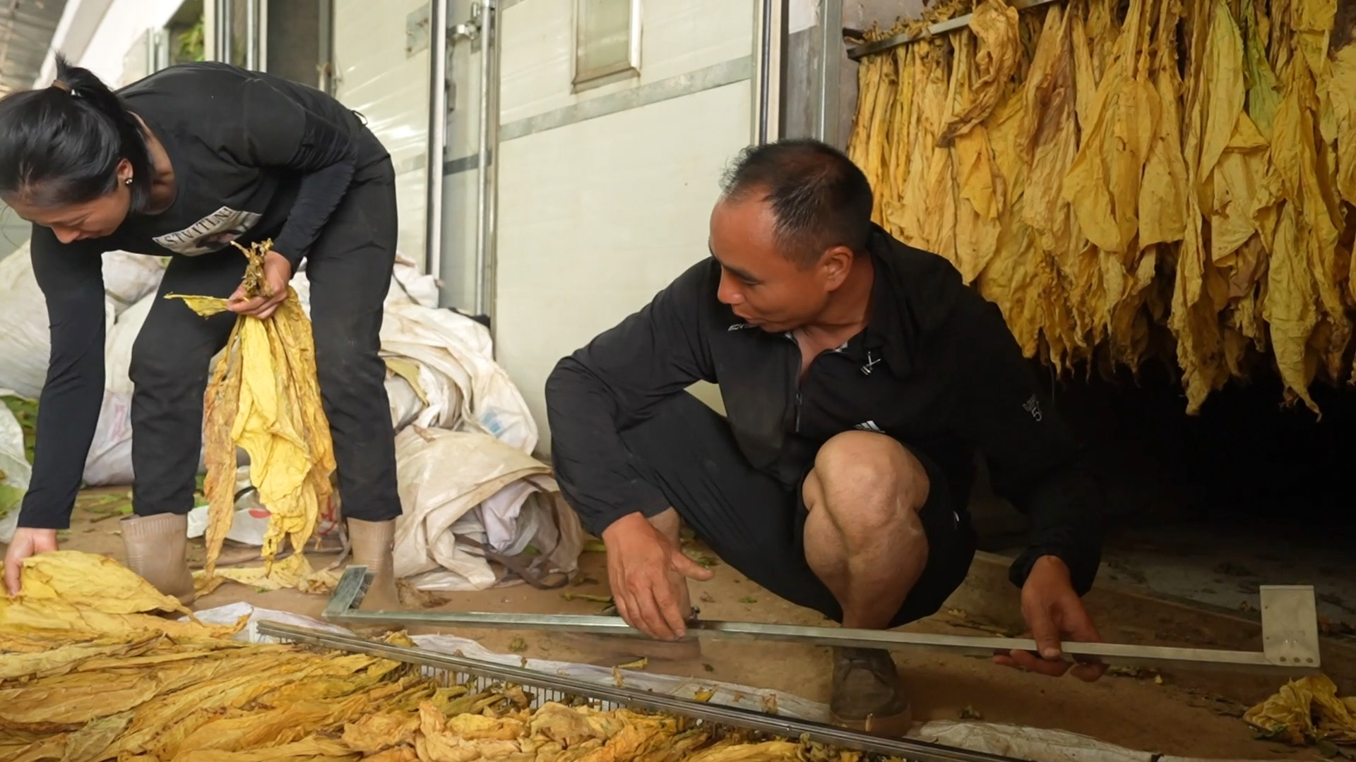 烘烤房内,烟农们根据烟叶大小、成熟度进行统一捆绑、编杆、上架、烘烤,并对出炉的金黄烟叶进行挑选,根据品质分别装袋。