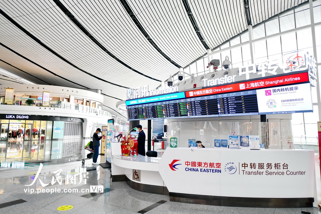 2023年1月7日,大兴国际机场航站楼国内出发层,乘客在中转服务柜台办理转机业务。
