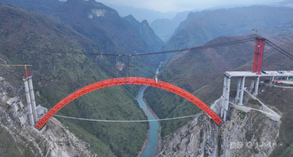 1月5日下午,贵州省安顺至盘州高速公路古牛河特大桥最后一节钢拱精准吊装到位,大桥顺利合龙。古牛河特大桥是安盘高速控制性工程,全长881.8米,主桥横跨古牛河,是520米跨径的上承式钢箱桁架拱桥,跨径居同类桥梁世界第二。主桥桥面到谷底高度约400米,在世界高桥中排名第15位。