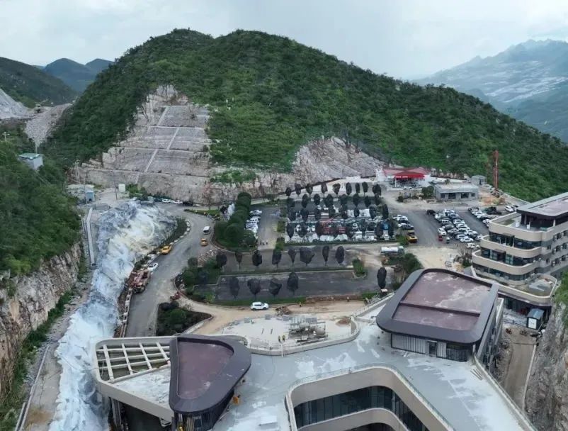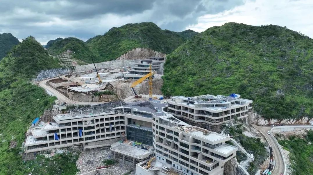 作为贵州省重点桥旅融合示范工程,服务区核心基础设施建设已基本完工,主体建筑均已封顶,全面转入室内外装饰装修阶段,工人们正紧锣密鼓进行细节完善和设备安装,确保项目能与世界第一高桥花江峡谷大桥同步竣工启用。