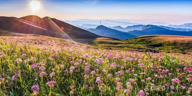 沿着木板步道往上走,漫山遍野的紫色小花在风里轻轻摇晃,空气里都是淡淡的清香。