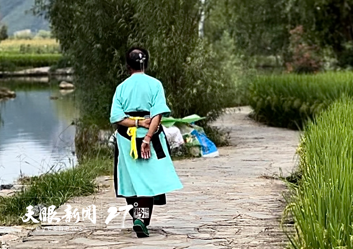 我在鲍家屯寨墙外的水碾房前拍下了一个屯堡妇女的背影。穿着的还是600年前的凤阳汉装,长衣大袖,丝头系腰。河风掀动她的衣角,她不疾不徐,越走越远。