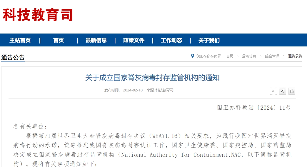 《关于成立国家脊灰病毒封存监管机构的通知》解读