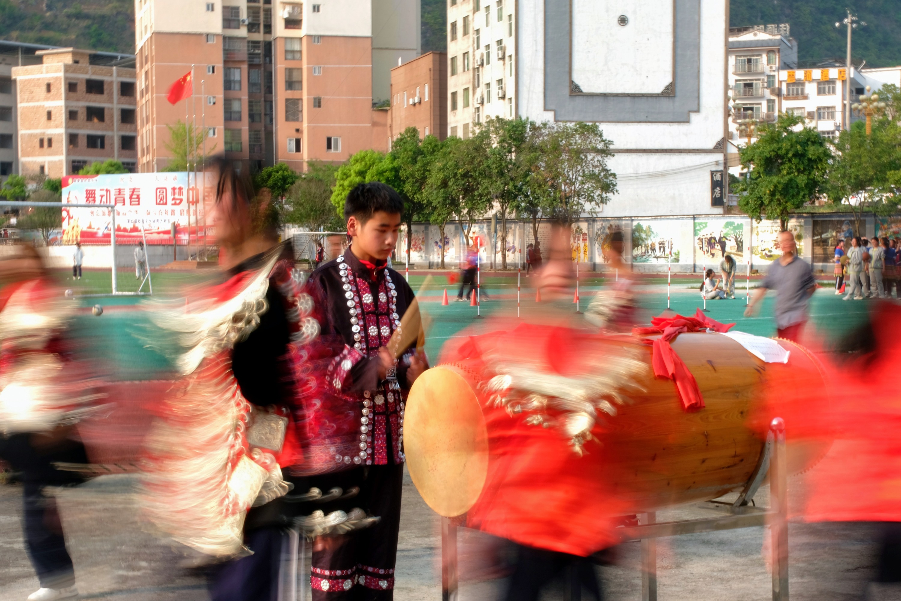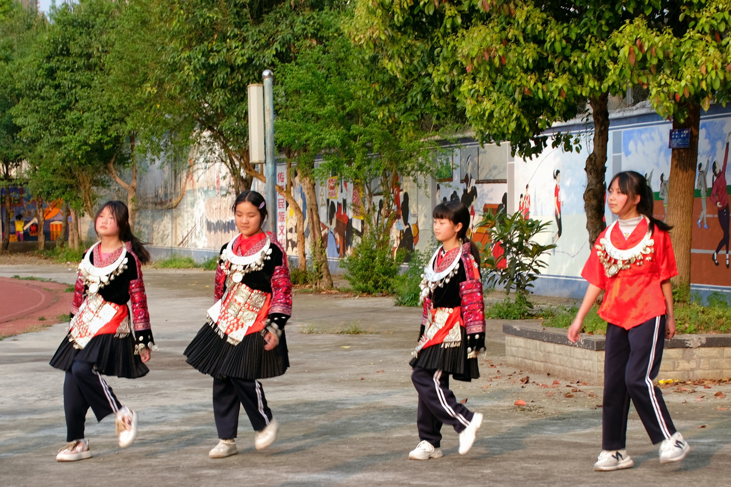 4月11日,在贵州省黔东南州施秉民族中学的操场上,身着苗族服装的同学们随着音乐鼓点跳起民族舞蹈。