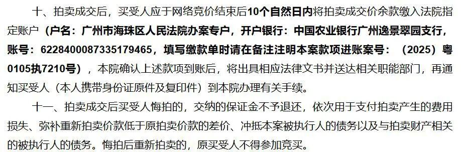 按平台规则,拍卖成交后,买受人应于网络竞价结束后10个自然日内将拍卖成交价余款缴入法院指定账户。今年1月16日,平台发布最新情况说明,称该标的物于2026年1月16日确定交易未履行,具体情况及后续安排可咨询广州市海珠区人民法院。