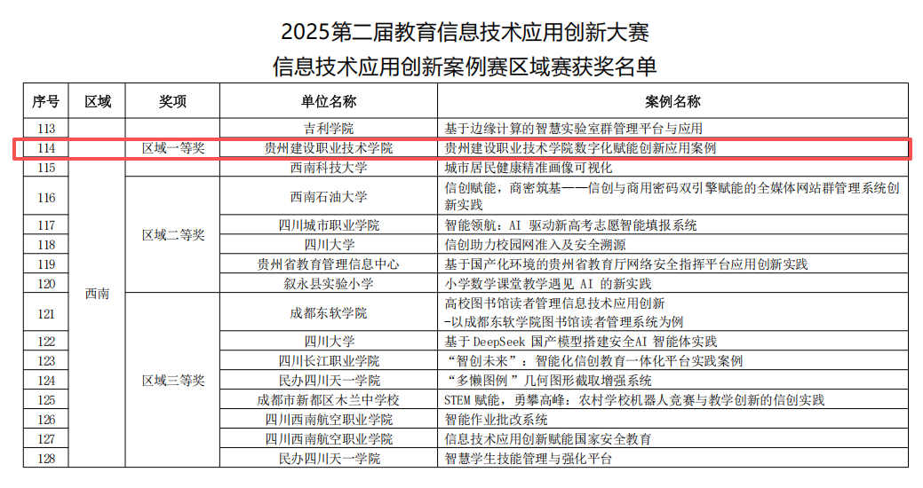 近日,2025第二届教育信息技术应用创新大赛区域赛结果正式公布。在“信息技术应用创新案例”赛项中,贵州建设职业技术学院凭借“数字化赋能创新应用案例”的鲜明特色与实践成效,从西南区域众多参赛院校中脱颖而出,成功获得西南区域赛一等奖,顺利拿到晋级全国总决赛的“入场券”,为贵州职业教育赢得荣誉。