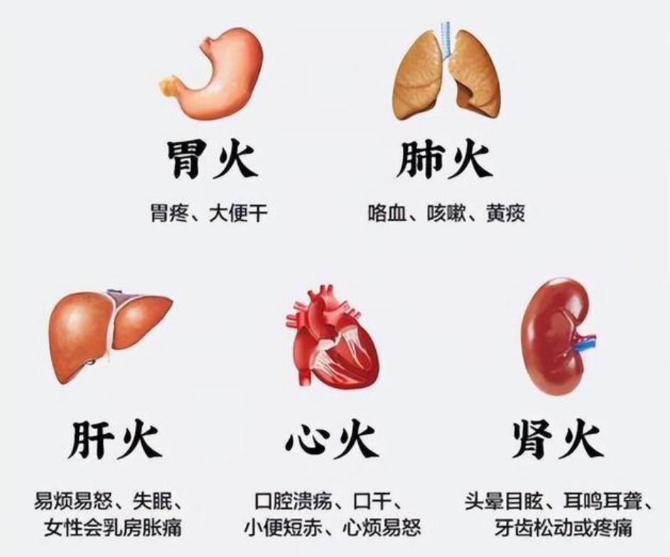中医讲的“上火”,主要有五火:心火、肝火、胃火、肺火、肾火。
