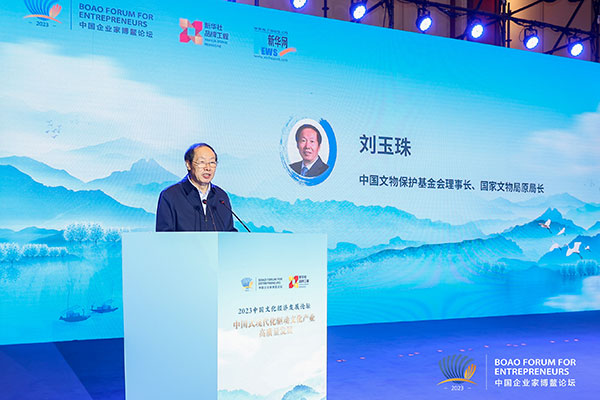 随后,中国文物保护基金会理事长、国家文物局原局长刘玉珠现场致辞。他认为,文化经济就是文化与经济的交融互动,文化与经济的交融共生,集中体现在文化产业空间的不断拓展。他还在致辞中着重提及了中国文物保护基金会与新华网合作推出的《文保会客厅》栏目深受关注,借助新华网的媒体影响力,促进公众对于文物事业的了解和参与。他表示,中国文物保护基金会将搭建广阔的平台加大传播力度,期待与更多的企业机构开展合作,共同助力文物事业的高质量发展,促进文物事业和文物产业的繁荣,推动实现中国式现代化。