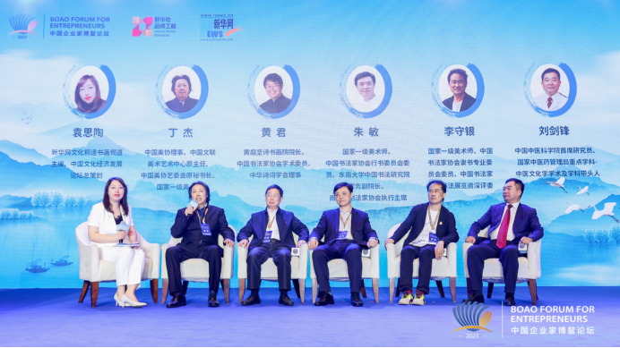 第二场圆桌对话以“中华优秀传统文化的创造性转化与创新性发展”为题,由新华网文化频道、书画频道主编,中国文化经济发展论坛总策划袁思陶担任主持。中国美协理事、中国文联美术艺术中心原主任、中国美协艺委会原秘书长、国家一级美术师丁杰在对话中表示,作为一名艺术家,在新时代要创造精品力作回报社会和人民。文化是源,文化是根,文化是我们的精神家园,我们要为精神家园添砖加瓦,做出自己的贡献。黄庭坚诗书画院院长、中国书法家协会学术委员、中华诗词学会理事黄君认为,书法家的创作要追求“三合一”,文字内容、作品形式和心情境界——三者的完美统一,这将会推动整个书法艺术与时代相结合,与历史相沟通,与未来相同步。国家一级美术师、中国书法家协会行书委员会委员、东南大学中国书法研究院常务副院长、南京市书法家协会执行主席朱敏则呼吁提高全民族书法艺术的鉴赏水平,提高书法的文化支撑。中国中医科学院首席研究员、国家中医药管理局重点学科-中医文化学学术及学科带头人刘剑锋表示中医药学是几千年的智慧结晶,它是有文化内涵的医学。推动中医药的传承发展,维护人类健康是将来的大趋势。国家一级美术师、中国书法家协会隶书专业委会委员李守银则结合自身的经历,在对话中发表了观点。