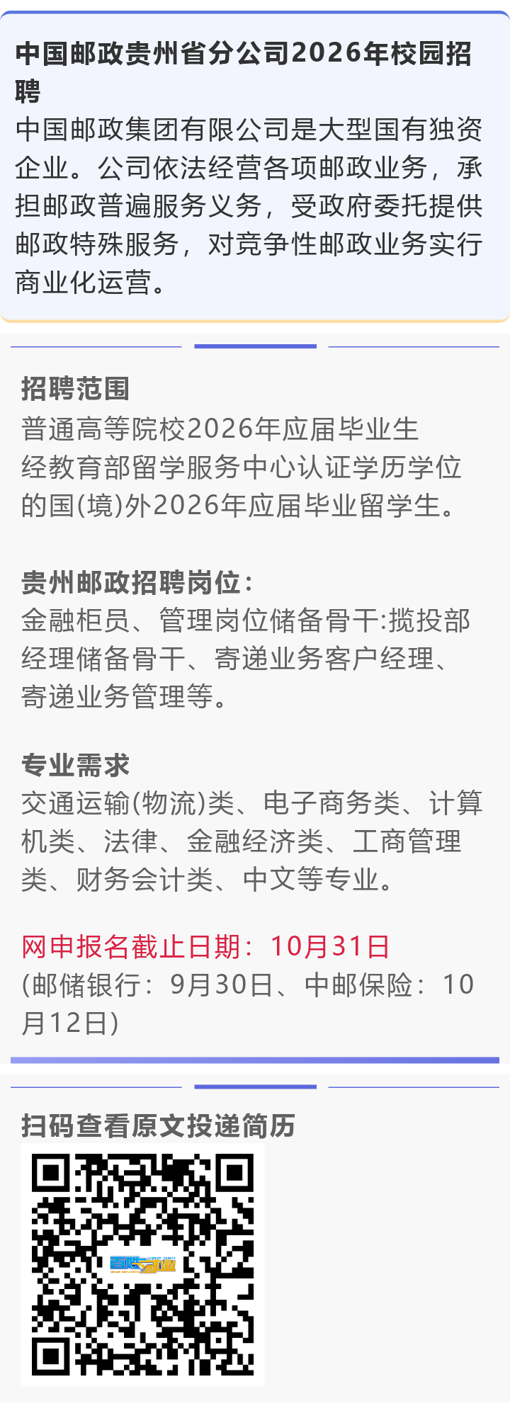 【国企】中国邮政贵州省分公司招聘!报名截止时间:10月31日!