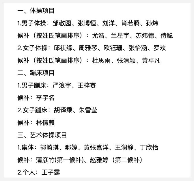 中国队体操、蹦床、艺术体操项目奥运参赛名单正在公示中。其中,中国体操男队以奥运冠军邹敬园和世锦赛冠军张博恒领衔,女队由17岁小将邱祺缘担纲。