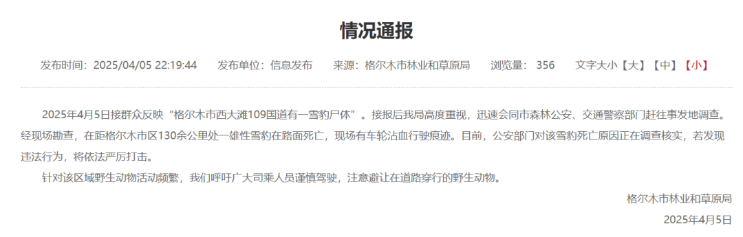 格尔木市林业和草原局同日发布情况通报称,接群众反映“格尔木市西大滩109国道有一雪豹尸体”。接报后高度重视,迅速会同市森林公安、交通警察部门赶往事发地调查。
