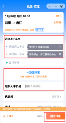2、挑选乘车日期、时间及上下车站点;填写乘车人信息并完成支付;