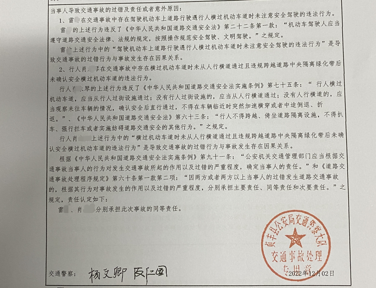 最终,民警依法认定,行人肖某横过机动车道时,未从过街设施通过且违规跨越中央隔离绿化带后,未确认安全横穿道路的违法行为,是导致事故的原因之一;驾驶员雷某驾驶机动车上道路行驶,遇行人横过机动车道时,未注意安全驾驶的违法行为是导致事故发生的另一原因;故肖某、雷某分别承担此次事故的同等责任。