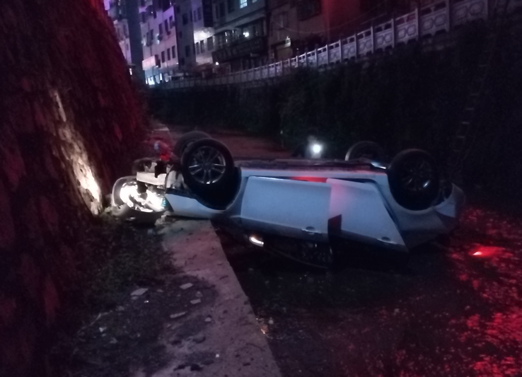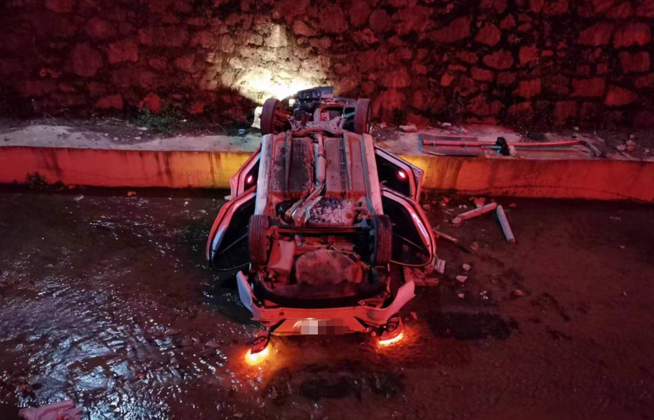 民警抵达凤冈县文峰村安置房停车场后的河道发现了一辆严重损毁,仰翻在河面的白色小轿车,经询问现场群众得知,驾驶员和乘车人都已经送往医院检查,看起来伤得不严重。