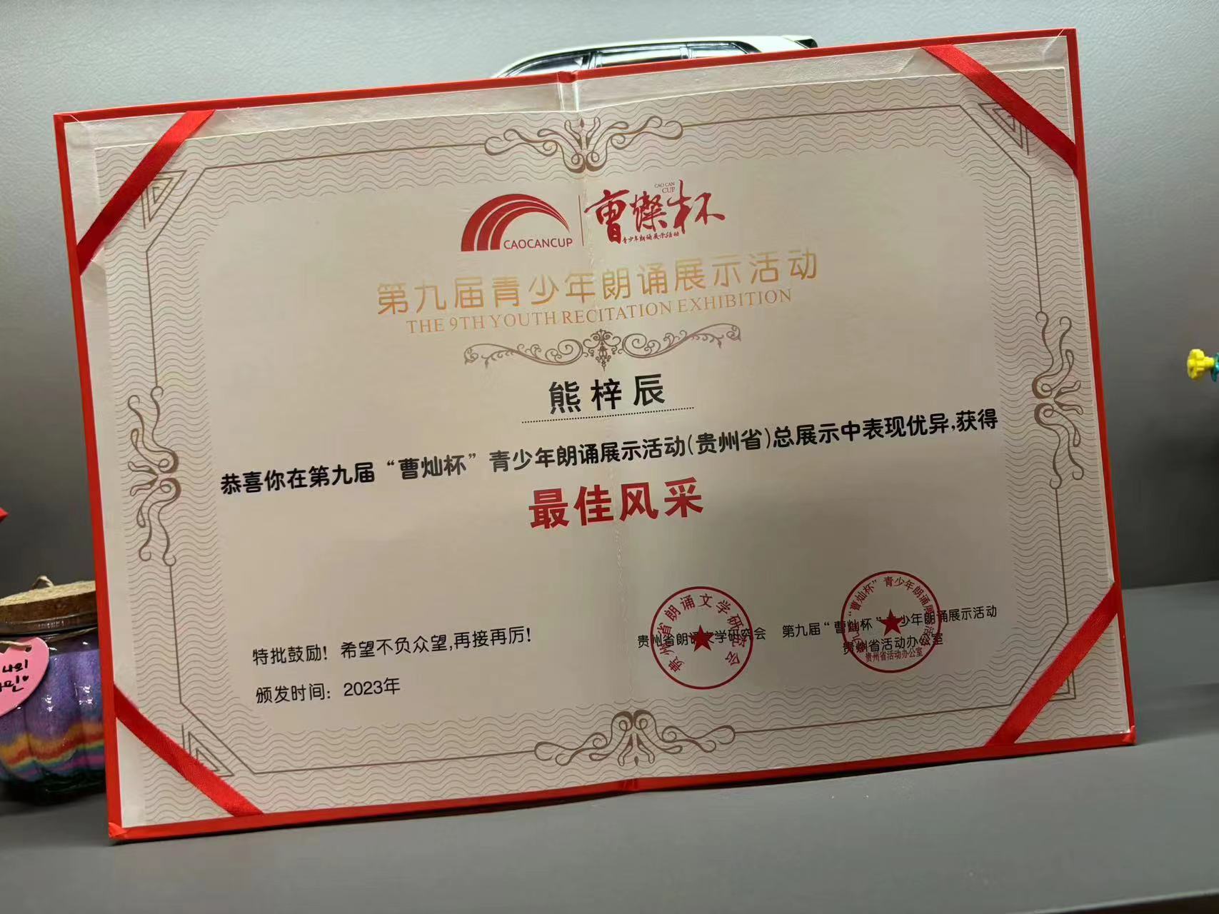第九届“曹灿杯”青少年朗诵展示活动(贵州省)总展演中荣获“最佳风采”奖;