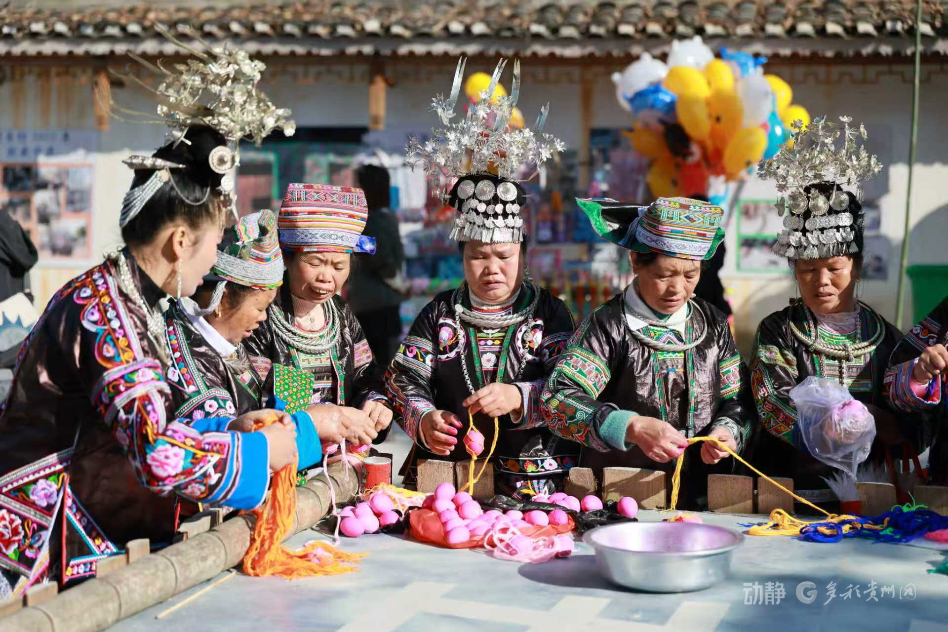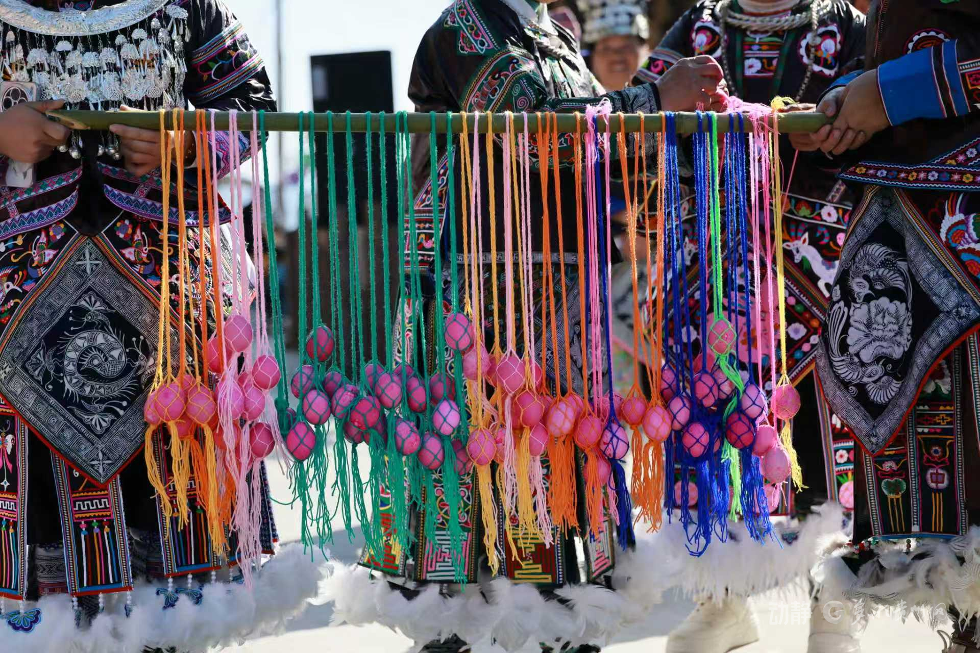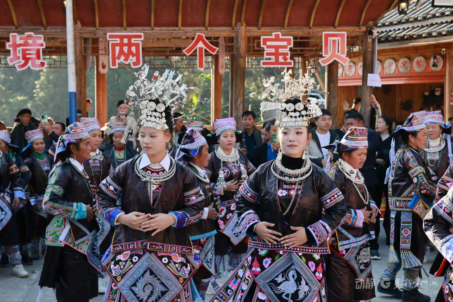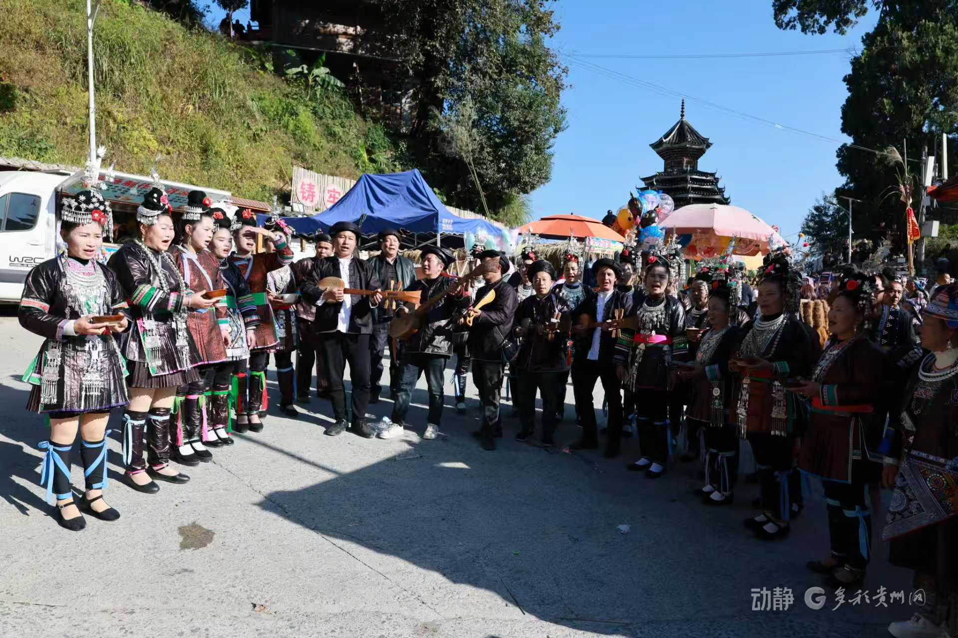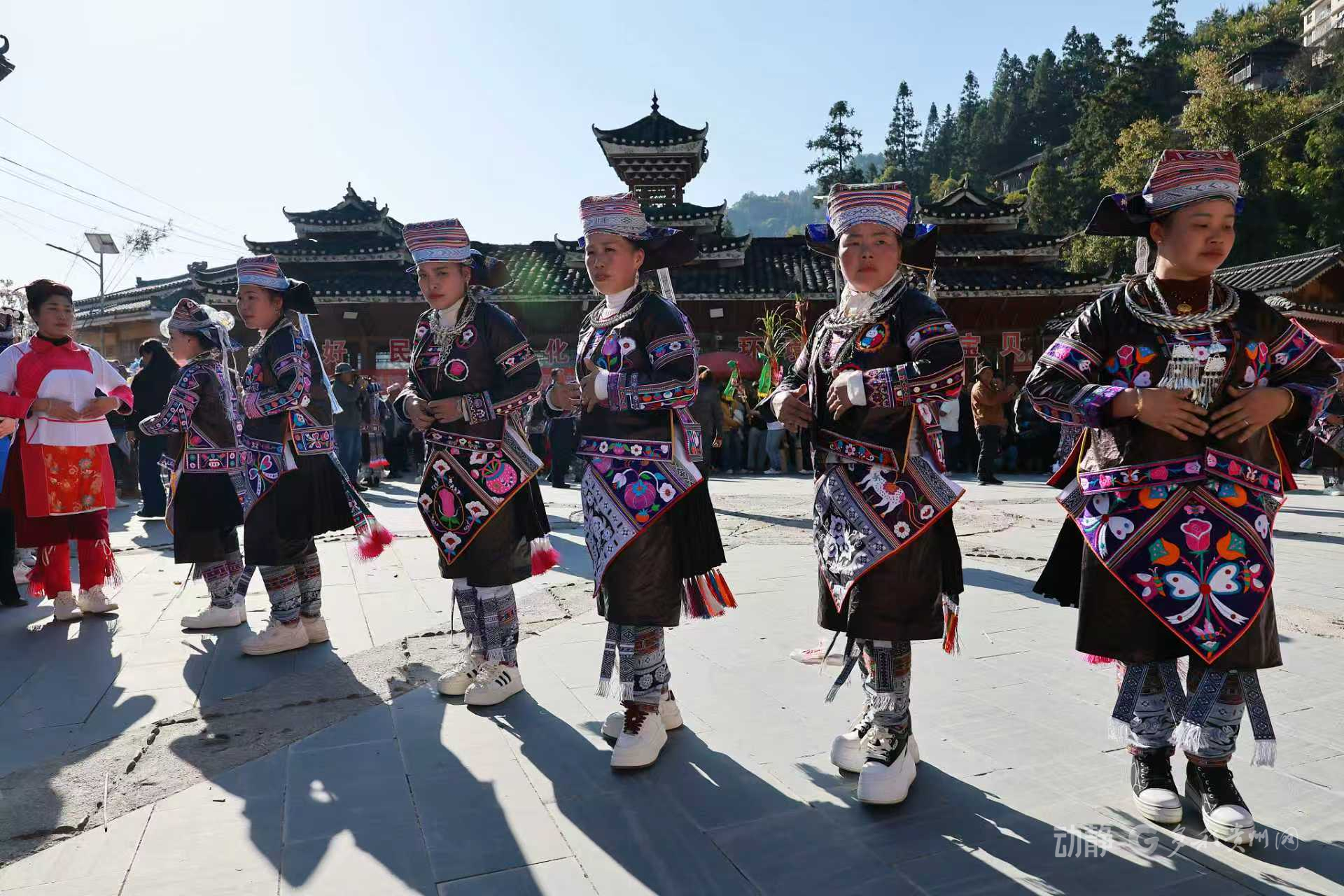 11月25日,贵州省黔东南苗族侗族自治州榕江县兴华乡摆贝村苗族群众迎来一年一度的苗家新年。当天,有着“云顶村庄千年摆贝”民间称谓的摆贝村,苗族同胞身着绣有百鸟图案和各类飞禽走兽的苗族盛装,欢聚在村头广场,吹起莽筒、敲响铜鼓、唱起古歌,载歌载舞欢庆苗年。